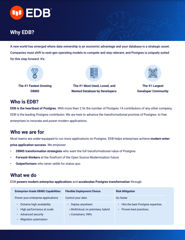 EnterpriseDB;EnterpriseDB;EnterpriseDB is the heartbeat of Postgres. With more than 2.5x the number of Postgres 14 contributors of any other company, EDB is the leading Postgres contributor. We are here to advance the transformational promise of Postgres: to free enterprises to innovate and power modern applications.