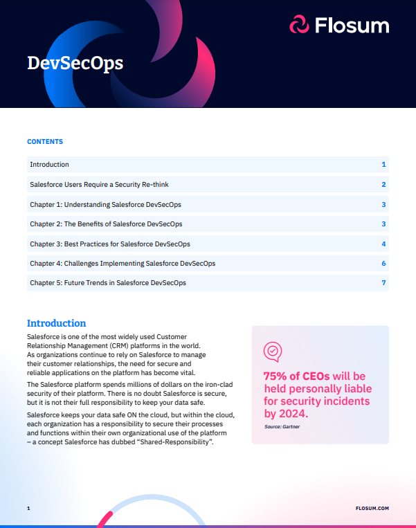 Flosum;Flosum;Salesforce DevSecOps is a framework that integrates security practices into the application development process – the combination of development (Dev), security (Sec), and operations (Ops) practices that are designed to bake security into every step of the application. Development lifecycle. Security can no longer be an afterthought, but instead needs to be a core part of the development process and culture of an organization.