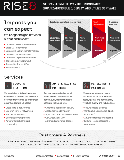 Rise8 drives relentless progress, transforming the way high compliance organizations build, deploy, and utilize software through digital solutions that create immediate and continuous impact with rapid outcomes in production.