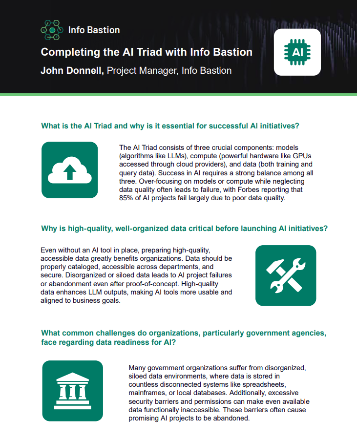 As Public Sector agencies work to adopt AI, they must overcome fragmented data and siloed environments to become AI-ready and drive successful initiatives. Achieving an effective AI strategy requires completing the AI Triad, a framework made up of algorithms, computing power and data. Info Bastion helps agencies address the data layer by securely connecting data sources, simplifying data management and schema mapping and integrating large language models (LLMs).
