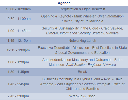Attend VMware Day at the Marriott Downtown Hotel in Philadelphia, Pennsylvania on May 17th to listen to industry experts discuss IT solutions that can digitally transform your agency or institute. Join the most topical tech sessions in state, local and education such as hybrid cloud, best practices, cloud security and app modernization solutions. This one-day event will allow you to connect with other industry professionals and share VMware product best practices.