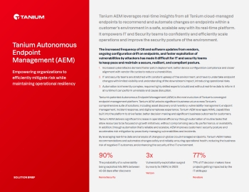 Tanium Autonomous Endpoint Management (AEM) leverages real-time data from cloud-managed endpoints to streamline IT and security processes, enhancing efficiency, security, and compliance. It identifies and addresses vulnerabilities proactively, automates tasks, and scales operations while offering actionable insights to support informed decision-making. AEM helps businesses maintain security and resilience by automating routine functions and enabling rapid responses to emerging risks.