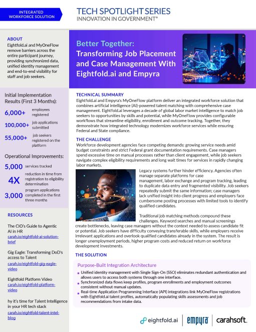Eightfold.ai leverages a decade of global labor market intelligence to match job seekers to opportunities by skills and potential, while myOneFlow provides configurable workflows that streamline eligibility, enrollment and outcome tracking. Together, they demonstrate how integrated technology modernizes workforce services while ensuring Federal and State compliance. In this Tech Spotlight, you will discover key benefits such as: